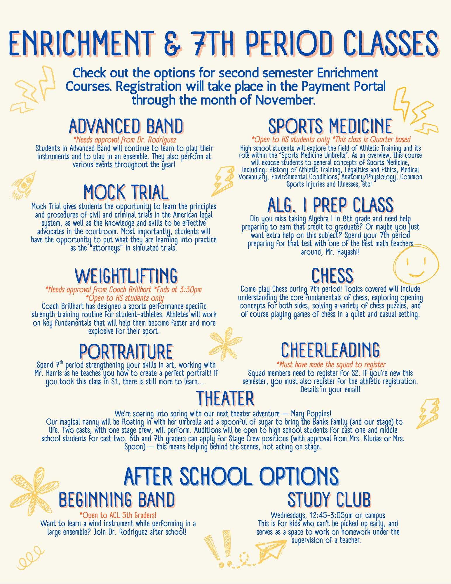 Students who did not get registered will be placed in a grade-level Study Hall for 7th period, where they can focus on finishing homework. 11th & 12th graders are welcome to leave at 2:30pm if they do not sign up for an Enrichment Course.